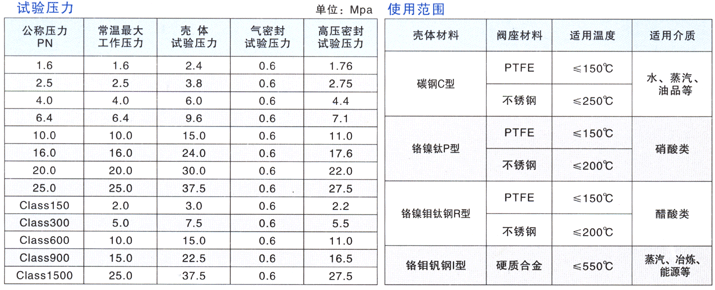 按照这种设计,每一密封环在两个方向提供完全密封,该系统使得阀腔中的过量压力不能自释放。这使得可以利用泄放阀腔压力或给阀腔加压来检验球阀的密封效果 三、性能规范: