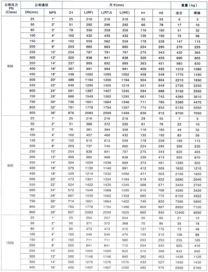 五、设计特征: 1、全焊接阀体 2、凸耳安装 3、弹簧载荷式阀座 4、金属密封或软密封 5、双关断及泄放功能 6、全同径或缩径 7、法兰连接或焊接端面 8、防挤出阀杆 9、在全开或全闭位置的充分输送管压力下可以处阀杆密封 10、防静电装置 11、自润滑轴承 12、按照API16D、APIFA、BS6755及NACE01-75(最新版)标准。 六、任选项: 1、紧急密封注入器 2、阀杆加长 3、加长输送管已用于排泄、通风及紧急密封注入器 4、特殊镀层 5、地下安装 6、直接给阀门添置旁路 7、锁定装置 8、其他设计特征和要求 七、主要连接尺寸及重量: